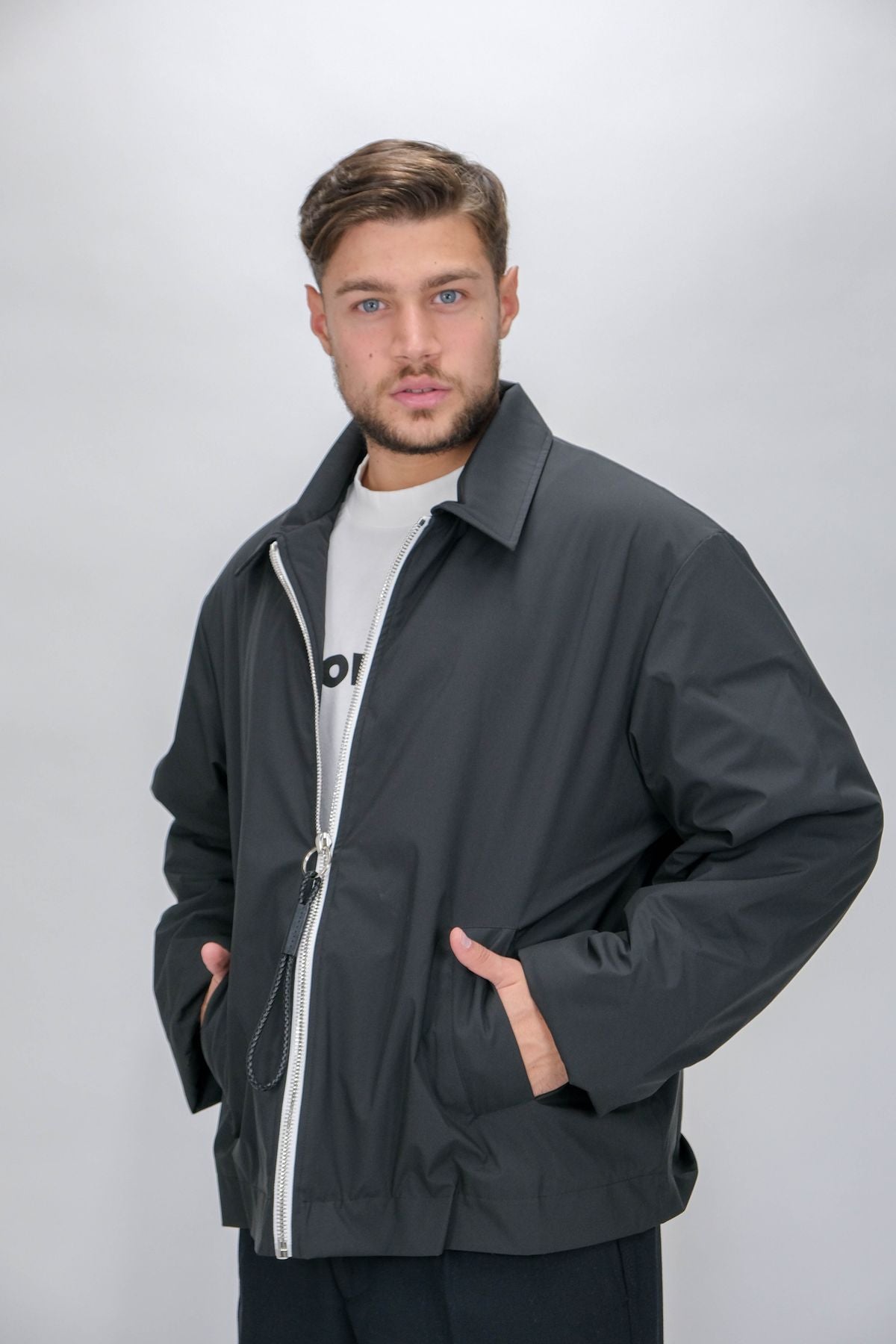-Chiusura frontale con zip con anello e laccio a contrasto colore